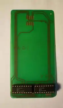 Complex Cards are smart cards that conform to the ISO/IEC 7810 standard and include components in addition to those found in traditional single chip smart cards. Complex Cards were invented by Cyril Lalo and Philippe Guillaud in 1999 when they designed a chip smart card with additional components, building upon the initial concept consisting of using audio frequencies to transmit data patented by Alain Bernard.[22] The first Complex Card prototype was developed collaboratively by Cyril Lalo and Philippe Guillaud, who were working at AudioSmartCard[23] at the time, and Henri Boccia and Philippe Patrice, who were working at Gemplus. It was ISO 7810-compliant and included a battery, a piezoelectric buzzer, a button, and delivered audio functions, all within a 0.84mm thickness card.