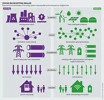 The generation of renewable energy can often be connected at the distribution level, instead of the transmission grids,[53] which means that DSO's can manage the flows and distribute power locally. This brings new opportunity for DSO's to expand their market by selling energy directly to the consumer. Simultaneously, this is challenging the utilities producing fossil fuels who already are trapped by high costs of aging assets.[54] Stricter regulations for producing traditional energy resources from the government increases the difficulty of stay in business and increases the pressure on traditional energy companies to make the shift to renewable energy sources.[55][56] An example of a utility changing business model to produce more renewable energy is the Norwegian-based company, Equinor, which was a state-owned oil company which now are heavily investing in renewable energy.