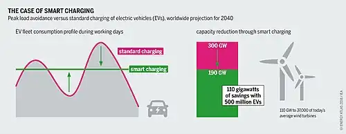 To reduce demand during the high-cost peak usage periods, communications and metering technologies inform smart devices in the home and business when energy demand is high and track how much electricity is used and when it is used. It also gives utility companies the ability to reduce consumption by communicating to devices directly in order to prevent system overloads. Examples would be a utility reducing the usage of a group of electric vehicle charging stations or shifting temperature set points of air conditioners in a city.[28] To motivate them to cut back use and perform what is called peak curtailment or peak leveling, prices of electricity are increased during high demand periods and decreased during low demand periods.[11] It is thought that consumers and businesses will tend to consume less during high-demand periods if it is possible for consumers and consumer devices to be aware of the high price premium for using electricity at peak periods. This could mean making trade-offs such as cycling on/off air conditioners or running dishwashers at 9 pm instead of 5 pm. When businesses and consumers see a direct economic benefit of using energy at off-peak times, the theory is that they will include the energy cost of operation into their consumer device and building construction decisions and hence become more energy efficient.