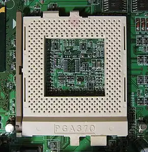 Socket 370, also known as PGA370, is a CPU socket first used by Intel for Pentium III and Celeron processors to first complement and later replace the older Slot 1 CPU interface on personal computers. The "370" refers to the number of pin holes in the socket for CPU pins.