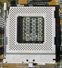 Socket 7 is a physical and electrical specification for an x86-style CPU socket on a personal computer motherboard. It was released in June 1995.[1] The socket supersedes the earlier Socket 5, and accepts P5 Pentium microprocessors manufactured by Intel, as well as compatibles made by Cyrix/IBM, AMD, IDT and others.[2] Socket 7 was the only socket that supported a wide range of CPUs from different manufacturers and a wide range of speeds.