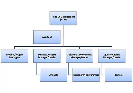 The manager of a software company is usually called the Head Of Development (HOD),[2] and reports to the stakeholders. He or she leads the sub-teams directly or via the managers/leaders depending on the size of the organization. Usually teams of up to 10 person are the most operational. In bigger organizations, there are in general two models of the hierarchy: