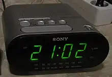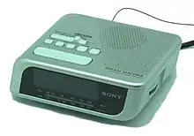 A clock radio with a large display and two independent alarms, which can be set to a radio or buzzer. Other features include a 0.9" green LED display, an extendable snooze bar, a built-in calendar with automatic daylight saving time adjustment and a lithium battery for a full power memory back up. Battery life is approximately up to 250 Days with the Sony battery. The model also has a built-in AM/FM radio, with a Ferrite bar antenna for AM, a wire antenna for FM, and mono 66mm speakers.[6]