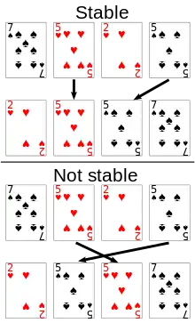 Within each suit, the stable sort preserves the ordering by rank that was already done. This idea can be extended to any number of keys and is utilised by radix sort. The same effect can be achieved with an unstable sort by using a lexicographic key comparison, which, e.g., compares first by suit, and then compares by rank if the suits are the same.
