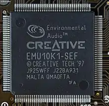 Sound Blaster Live! (August 1998) saw the introduction of the EMU10K1 audio processor. Manufactured in a 0.35 µm 3-metal-layer CMOS process, it is a 2.44 million transistor ASIC rated at 1000 MIPS. The EMU10K1 featured hardware acceleration for DirectSound and EAX 1.0 and 2.0 (environmental audio extensions), along with a high-quality 64-voice MIDI sample-based synthesizer and an integrated FX8010 DSP chip for real-time digital audio effects.[2]