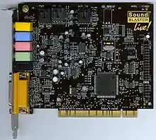 Sound Blaster Live! is a PCI add-on sound card from Creative Technology Limited for PCs. Moving from ISA to PCI allowed the card to dispense with onboard memory, storing digital samples in the computer's main memory and then accessing them in real time over the bus. This allowed for a much wider selection of, and longer playing, samples. It also included higher quality sound output at all levels, quadrophonic output, and a new MIDI synthesizer with 64 sampled voices. The Live! was introduced on August 11, 1998[1] and variations on the design remained Creative's primary sound card line into the early 2000's.