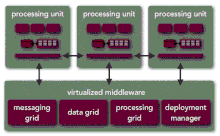Component Description Messaging grid Handles the flow of incoming transaction as well as the communication between services Data grid Manages the data in distributed memory with options for synchronizing that data with an underlying database Processing grid Parallel processing component based on the master/worker pattern (also known as a blackboard pattern) that enables parallel processing of events among different services