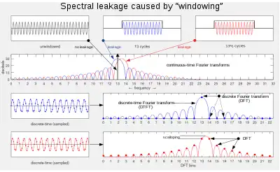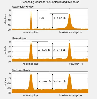 When the input waveform is time-sampled, instead of continuous, the analysis is usually done by applying a window function and then a discrete Fourier transform (DFT). But the DFT provides only a sparse sampling of the actual discrete-time Fourier transform (DTFT) spectrum. Figure 2, row 3 shows a DTFT for a rectangularly-windowed sinusoid. The actual frequency of the sinusoid is indicated as "13" on the horizontal axis. Everything else is leakage, exaggerated by the use of a logarithmic presentation. The unit of frequency is "DFT bins"; that is, the integer values on the frequency axis correspond to the frequencies sampled by the DFT.[2]: p.56 eq.(16) So the figure depicts a case where the actual frequency of the sinusoid coincides with a DFT sample, and the maximum value of the spectrum is accurately measured by that sample. In row 4, it misses the maximum value by ½ bin, and the resultant measurement error is referred to as scalloping loss (inspired by the shape of the peak). For a known frequency, such as a musical note or a sinusoidal test signal, matching the frequency to a DFT bin can be prearranged by choices of a sampling rate and a window length that results in an integer number of cycles within the window.