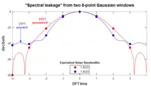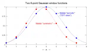 - ↑ An example of the effect of truncation on spectral leakage is figure Gaussian windows. The graph labeled DTFT periodic8 is the DTFT of the truncated window labeled periodic DFT-even (both blue). The green graph labeled DTFT symmetric9 corresponds to the same window with its symmetry restored. The DTFT samples, labeled DFT8 periodic summation, are an example of using periodic summation to sample it at the same frequencies as the blue graph.