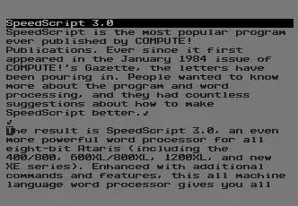 In April 1983 Compute! published Scriptor, a word processor written by staff writer Charles Brannon in BASIC and assembly language, as a type-in program for the Atari 8-bit family.[4] In January 1984 version 1.0 of his new word processor SpeedScript appeared in Compute!'s Gazette for the Commodore 64 and VIC-20.[1] 1.1 appeared in Compute!'s Second Book of Commodore 64,[5] 2.0 on Gazette Disk in May 1984,[6][7] and 3.0 in Compute! in March and April 1985.[8][9] Corrections that updated 3.0 to 3.1 appeared in May 1985,[10] and the full 3.1 version appeared in a book published by Compute!, SpeedScript: The Word Processor for the Commodore 64 and VIC-20.[11]
