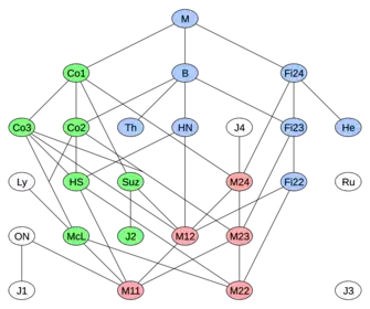 - ↑ Conway et al. (1985, p. viii) organizes the 26 sporadic groups in likeness: