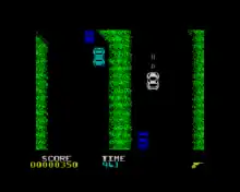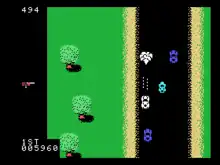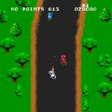 Various enemy vehicles try to destroy the player's car or force it off the road, including a helicopter that drops bombs from overhead. A counter increments the score while the car is moving and on the road. Additional points are earned by destroying enemy vehicles using weapons or forcing them off the road. After an initial lead-in time during which the player has an unlimited supply of cars, the player must earn extra cars by reaching score thresholds. Destroying non-enemy cars halts the score counter for a short while, and no points are scored whenever the player's car is off the road. The car can be destroyed by a hard collision with another vehicle, if it is hit by an enemy weapon (including the craters blasted into the road by the helicopter's bombs), or by running far enough off the roadway (or waterway).