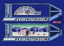 Spy vs. Spy III: Arctic Antics[1] switches the location from a tropical island to the arctic. The spies fight by throwing snowballs at each other and setting traps, which decreases their body heat bar. Tools include a saw to cut holes in the ice for the second player to fall into. Lost body heat can be restored by moving into a heated igloo.