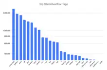 As of March 2024 Stack Overflow has over 23 million registered users,[15] and has received over 24 million questions and 35 million answers.[16] The site and similar programming question and answer sites have globally mostly replaced programming books for day-to-day programming reference in the 2000s, and today are an important part of computer programming.[17] Based on the type of tags assigned to questions, the top eight most discussed topics on the site are: JavaScript, Java, C#, PHP, Android, Python, jQuery, and HTML.[18]