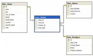 Consider a database of sales, perhaps from a store chain, classified by date, store and product. The image of the schema to the right is a star schema version of the sample schema provided in the snowflake schema article.