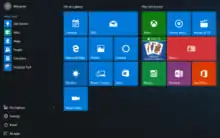 Windows 10 re-introduced the Start menu in a revised form. It uses a two column design similar to Windows 7's version, except that the right side is populated by tiles, similarly to Windows 8's Start screen. Applications can be pinned to the right half, and their respective tiles can be resized and grouped into user-specified categories. The left column displays a vertical list, containing frequently-used applications, and links to the "All apps" menu, File Explorer, Settings, and power options. Some of these links, and additional links to folders such as Downloads, Pictures, and Music, can be added through Settings' "Choose which folders appear on Start" page. The Start menu can be resized, or be placed in a full-screen display resembling the Windows 8/8.1 Start screen (although scrolling vertically instead of horizontally).[8][9] The Start menu also enters this state when "Tablet mode" is enabled.[10][11][12][13]