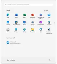 Windows 11 introduces another major redesign to the Start menu. A search box was reinstated at the top of the menu, and tiles have been replaced by an area for pinned application shortcuts displayed in a grid (similar to many application launchers in Android and iOS), accompanied by a section for "Recommended" applications and files (often equivalent with the user's most recently used files). An "All apps" button is displayed next to the heading for pinned applications. Windows 11 does not support live tiles, with their functionality being moved to the separate "Widgets" area on the taskbar.[19][20]