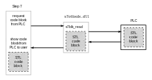 According to researcher Ralph Langner,[72][73] once installed on a Windows system, Stuxnet infects project files belonging to Siemens' WinCC/PCS 7 SCADA control software[74] (Step 7), and subverts a key communication library of WinCC called s7otbxdx.dll. Doing so intercepts communications between the WinCC software running under Windows and the target Siemens PLC devices, when the two are connected via a data cable. The malware is able to modify the code on PLC devices unnoticed, and subsequently to mask its presence from WinCC if the control software attempts to read an infected block of memory from the PLC system.[67]