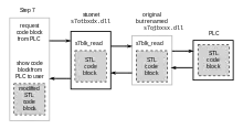 Stuxnet has three modules: a worm that executes all routines related to the main payload of the attack; a link file that automatically executes the propagated copies of the worm; and a rootkit component responsible for hiding all malicious files and processes, to prevent detection of Stuxnet.[11] It is typically introduced to the target environment via an infected USB flash drive, thus crossing any air gap. The worm then propagates across the network, scanning for Siemens Step7 software on computers controlling a PLC. In the absence of either criterion, Stuxnet becomes dormant inside the computer. If both the conditions are fulfilled, Stuxnet introduces the infected rootkit onto the PLC and Step7 software, modifying the code and giving unexpected commands to the PLC while returning a loop of normal operation system values back to the users.[12][13]