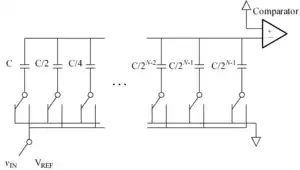 One of the most common implementations of the successive-approximation ADC, the charge-redistribution successive-approximation ADC, uses a charge-scaling DAC. The charge-scaling DAC simply consists of an array of individually switched binary-weighted capacitors. The amount of charge upon each capacitor in the array is used to perform the aforementioned binary search in conjunction with a comparator internal to the DAC and the successive-approximation register.
