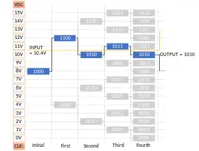 - In n-th clock cycle, if voltage is higher than digital equivalent voltage of the number in register, the (n+1)-th digit from the left is set to 1. If the voltage were lower than digital equivalent voltage, then n-th digit from left is set to zero and the next digit is set to 1. To perform a conversion, an N-bit ADC requires N such clock cycles excluding the initial state.