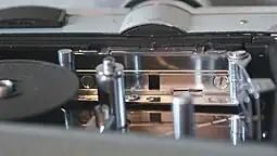 In 1973 Kodak introduced Ektasound—magnetic recording on the actual Super 8 film.[39] The sound track was added on the edge of the film opposite to the perforations. Standard 8mm had the stripe between the perforations and the edge of the film which made good contact with a magnetic head problematic. A balance stripe was added on the opposite edge to facilitate spooling of the film. The Ektasound cartridge was deeper than the silent cartridge to allow access of the camera's recording head. Thus, silent cameras could not accept Ektasound cartridges, but Ektasound cameras and projectors accepted silent cartridges. Projectors, that could record and play sound, appeared before sound cameras. The sound was recorded 18 frames in advance of the picture (as opposed to 56 frames for standard 8mm). This short distance of just 3 inches facilitated the relatively compact size of the later sound cartridges. Some projectors used the balance stripe to provide a second channel for stereo sound.
