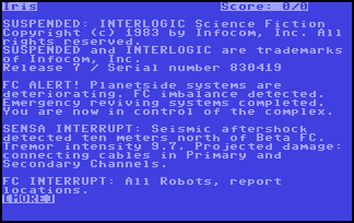 Suspended: A Cryogenic Nightmare is an interactive fiction video game written by Michael Berlyn and published by Infocom in 1983. Infocom's sixth game, it was released for Amstrad CPC, Apple II, Atari 8-bit computers, Commodore 64, Commodore Plus/4, IBM PC compatibles (as a self-booting disk), TRS-80, and TI-99/4A. It was later available for Mac, Amiga, and Atari ST.[1]