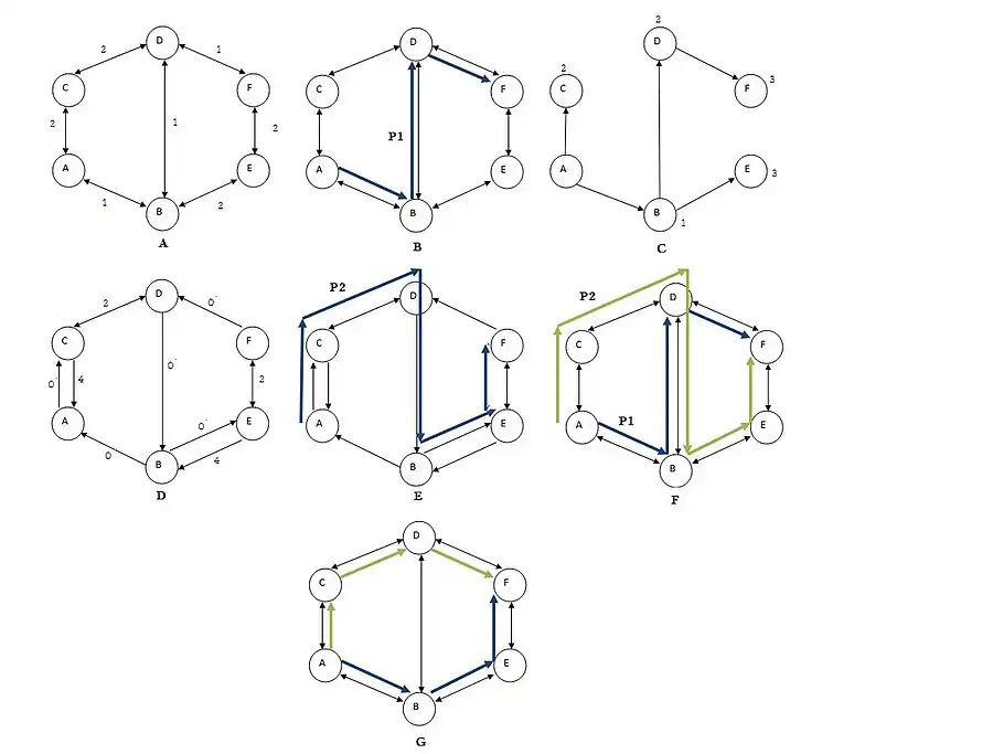 Figure G finds the shortest pair of disjoint paths by combining the edges of paths P1 and P2 and then discarding the common reversed edges between both paths (B–D). As a result, we get the two shortest pair of disjoint paths (A–B–E–F) and (A–C–D–F).