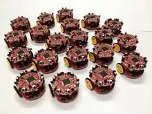 Swarm robotic platforms apply swarm robotics[1] in multi-robot collaboration.[2] They take inspiration from nature (e.g. collective problem solving mechanisms seen in nature such as honey bee aggregation[3][4]). The main goal is to control a large number of robots (with limited sensing/processing ability) to accomplish a common task/problem. Hardware limitation and cost of robot platforms limit current research in swarm robotics to mostly performed by simulation software (e.g. Stage,[5] ARGoS[6]). On the other hand, simulation of swarm scenarios that needs large numbers of agents is extremely complex and often inaccurate due to poor modelling of external conditions and limitation of computation.