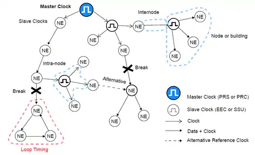A timing loop is in bad synchronization when the clock signal has closed itself, but there is no clock, either master or slave, that would autonomously generate a non-deficient clock signal. This situation can be caused by a fault affecting an NE in such a way that it has been left without a reference clock, and therefore it has chosen an alternative synchronization: a signal that has turned out to be the same signal, returning by another route. A synchronization loop is a completely unstable situation that may provoke an immediate collapse of part of the network within the loop.
