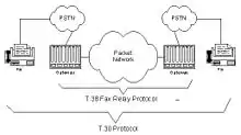 There are two primary ways that fax transactions are conveyed across packet networks. The T.37 standard specifies how a fax image is encapsulated in e-mail and transported, ultimately, to the recipient using a store-and-forward process through intermediary entities. T.38, however, defines a protocol that supports the use of the T.30 protocol in both the sender and recipient terminals. (See diagram above.) T.38 lets one transmit a fax across an IP network in real time, just as the original G3 fax standards did for the traditional (time-division multiplexed (TDM)) network, also called the public switched telephone network or PSTN.