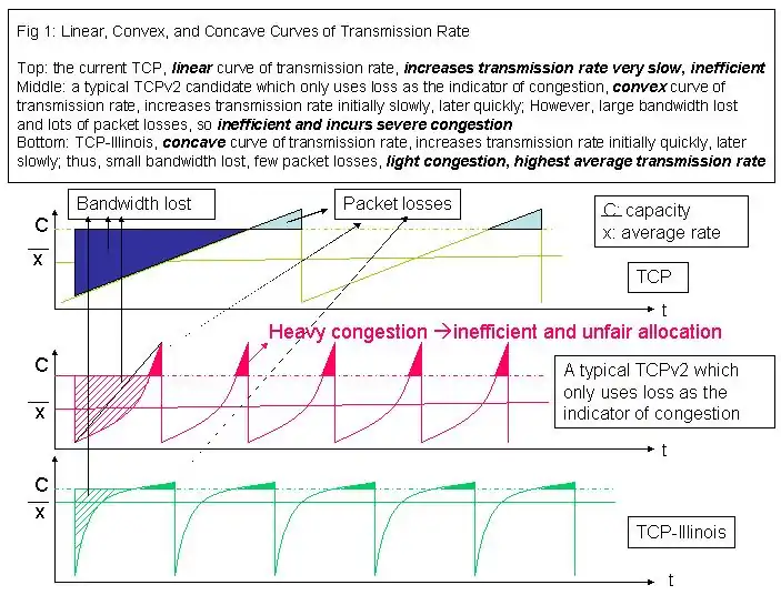 TCP-Illinois increases the throughput much more quickly than TCP when congestion is far and increases the throughput very slowly when congestion is imminent. As a result, the window curve is concave and the average throughput achieved is much larger than the standard TCP, see Figure 2.