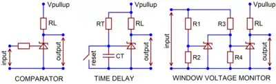 On-state VCA drops to around 2 V, which is compatible with Transistor–transistor logic (TTL) and CMOS logic gates with 5 V power supply.[40] Low-voltage CMOS (e.g. 3.3 V or 1.8 V logic) requires level conversion with a resistive voltage divider,[40] or replacing the TL431 with a low-voltage alternative like the TLV431.[41]