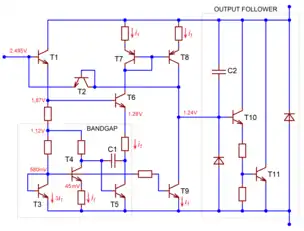 On a functional level the TL431 contains an open-loop operational amplifier that compares the input control voltage with a 2.495 V voltage reference.[5] This, however, is merely an abstraction: both functions are inextricably linked inside the TL431's front end. There is no physical 2.495 V source: the actual internal reference is provided by a 1.2 V Widlar bandgap (transistors T3, T4, T5), driven by the input emitter followers T1, T6.[6] This enables correct operation even when the cathode-anode voltage drops below 2.495 V, down to around 2.0 V minimum. The differential amplifier is made of two current sources (T8, T9); the positive difference of their currents sinks into the base of T10.[6] The output open collector transistor, T11, can sink currents up to 100 mA, and is protected from polarity reversal with a reverse diode.[4][5] The circuit does not provide protection against excessive current or overheating.[4][5]