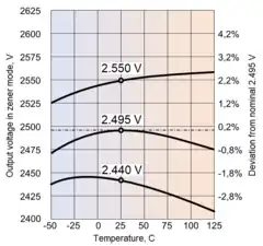 - Temperature. Thermal plot of a bandgap reference voltage has a hump-like shape. By design, the hump is centered on +25 °C (77 °F), where VREF=2.495 V; above and below +25 °C (77 °F), VREF gently decreases by a few millivolts. However, if a specific IC deviates substantially from the norm, the hump shifts to lower or higher temperatures; in the worst outliers it degenerates into a monotonously rising or falling curve.[15] [12]