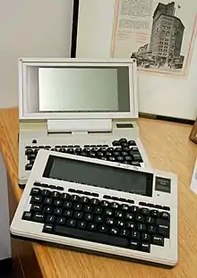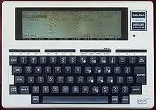 The TRS-80 Model 100 is a notebook-sized portable computer introduced in April 1983. It was the first commercially successful notebook computer, as well as one of the first notebook computers ever released.[1] It features a keyboard and liquid-crystal display, in a battery-powered package roughly the size and shape of a notepad or large book. The 224-page, spiral-bound User Manual is nearly the same size as the computer itself.