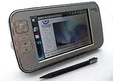 Nokia had plans for an Internet tablet since before 2000. An early model was test manufactured in 2001, the Nokia M510, which was running on EPOC and featuring an Opera browser, speakers and a 10-inch 800×600 screen, but it was not released because of fears that the market was not ready for it.[46] Nokia entered the tablet space in May 2005 with the Nokia 770 running Maemo, a Debian-based Linux distribution custom-made for their Internet tablet line. The user interface and application framework layer, named Hildon, was an early instance of a software platform for generic computing in a tablet device intended for internet consumption.[47] But Nokia did not commit to it as their only platform for their future mobile devices and the project competed against other in-house platforms and later replaced it with the Series 60.[48] Nokia used the term internet tablet to refer to a portable information appliance that focused on Internet use and media consumption, in the range between a personal digital assistant (PDA) and an Ultra-Mobile PC (UMPC). They made two mobile phones, the N900 that runs Maemo, and N9 that run Meego.[49]
