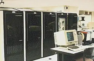In 1986, Tandem introduced a third generation CPU, the NonStop VLX.[14] It had 32-bit datapaths, wider microcode, 12 MHz cycle time, and a peak rate of one instruction per microcycle. It was built from three boards of ECL gate array chips (with TTL pinout). It had a revised Dynabus with speed raised to 20 MB/s per link, 40 MB/s total. Later, FOX II increased the physical diameter of TNS clusters to 4 kilometers.