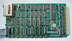 Additional boards became available with time, including a 40K memory board - TANRAM, made up of 32K of dynamic and 8K of static RAM, bringing the total non-paged memory to 48K, a dedicated parallel I/O board featuring 16 parallel input/output ports; a similar dedicated serial I/O board featuring 8 serial input/output ports, a disk controller board for use with disk drives, a Disk Operating System - TANDOS 65, a high resolution graphics board featuring 8K of static graphics RAM giving a resolution of 256 × 256 pixels, a dedicated 32K ROM board, (aimed mainly at OEM and general purpose applications or for use with AIM, KIM and SYM systems), capable of holding either 8 × 2732 or 16 × 2716 EPROMs; and a 32K RAM board featuring two 16K banks of 4116 dynamic RAM, again intended for similar purposes to the 32K ROM board. In addition, several third-party suppliers offered boards designed for use with the Microtan 65 system.