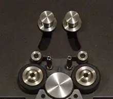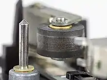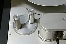 The capstan is a rotating spindle used to move recording tape through the mechanism of a tape recorder. The tape is threaded between the capstan and one or more rubber-covered wheels, called pinch rollers, which press against the capstan, thus providing friction necessary for the capstan to pull the tape. The capstan is always placed downstream (in the direction of tape motion) from the tape heads. To maintain the required tension against the tape heads and other part of the tape transport, a small amount of drag is placed on the supply reel. Tape recorder capstans have a function similar to nautical capstans, which however have no pinch rollers, the line simply being wound around them.