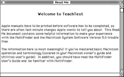 The TeachText application is a simple text editor made by Apple Computer and included with System 7.1 and earlier.[1] It was created by Apple programmer Bryan Stearns[2] with later versions created by Stearns and Francis Stanbach.[3] TeachText was one of the only applications included with System 7, leading to its frequent role as the application to open "ReadMe" files. It was named "TeachText" as a nod to this role in tutorials and other introductory materials.[4]