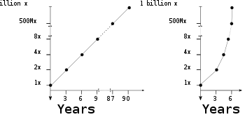 In addition to general criticisms of the singularity concept, several critics have raised issues with Kurzweil's iconic chart. One line of criticism is that a log-log chart of this nature is inherently biased toward a straight-line result. Others identify selection bias in the points that Kurzweil chooses to use. For example, biologist PZ Myers points out that many of the early evolutionary "events" were picked arbitrarily.[83] Kurzweil has rebutted this by charting evolutionary events from 15 neutral sources, and showing that they fit a straight line on a log-log chart. Kelly (2006) argues that the way the Kurzweil chart is constructed with x-axis having time before present, it always points to the singularity being "now", for any date on which one would construct such a chart, and shows this visually on Kurzweil's chart.[84]