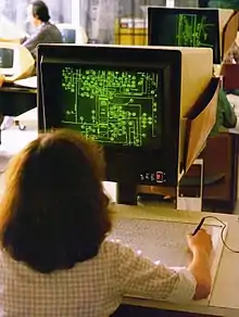 Because the display tube itself stored the image, there was no need for any sort of auxiliary graphics memory, greatly lowering the cost of the terminal. The 4010 cost $3,950, almost two orders of magnitude less expensive than IBM's competing graphics displays.[6] This made very complex and detailed computer graphics practical for a much wider audience. The Tektronix approach also had the advantage that there was no limit to the number of vectors that can be displayed; one could simply keep adding them to a complex image, whereas a solution like the IBM terminal had a limited number of vectors it could refresh on its display. Early CAD systems made by companies such as Computervision took full advantage of the graphic storage capability, and were able to display arbitrarily complex designs without annoying flicker.[25]