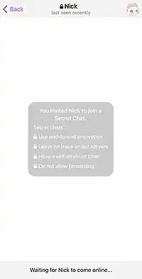 Users have the option to start a one-on-one, end-to-end-encrypted “Secret Chat”,[77] which remains accessible only on the device where it was started and self-destructs upon logging out.[25][78][79] Secret Chats restrict screenshotting from Android devices and warn when one is taken from an iOS device, while also hiding the chat contents from the final image.[80] Secret Chats support perfect forward secrecy and switch encryption keys after a key has been used 100 times or a week has passed.[81][59][60][82][83] Secret Chats are only available on Android, iOS and macOS clients.[84]