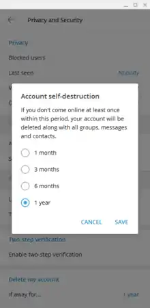 Both in Secret and regular chats, messages can self-destruct after they are read, disappearing for all parties after a period set by the user, ranging from 1 day to 1 year.[85][86]