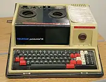 The Teleram P-1800 is a portable terminal measuring 18 by 13 by 7 inches (46 by 33 by 18 cm) and weighing 32 pounds (15 kg). Its exterior chassis was described by The New Yorker as a "small blue suitcase".[7] It contains a seven-inch cathode-ray tube for editing and communications functions and a Selectric-style keyboard with various function keys, including scrl, home, del word, del char, close, open, and insrt. The terminal's scratchpad memory allows 2,048 characters to be stored at a time; when this is used up, the preceding portion of the article is automatically saved to cassette tape via the built-in tape deck. Each cassette can store up to 170,000 characters. The CRT monitor can display up to 616 characters simultaneously, adjacent segments scrolling smoothly into view from memory via the move of a cursor. The P-1800 allows characters to be inserted mid-sentence, moving the rest of the paragraph to the right as new words are typed. The keyboard's function keys allowed characters, lines, and paragraphs to be deleted instantaneously. Once a document is composed, the user can remote into a mainframe by placing a telephone on the P-1800's acoustic coupler, dialing that mainframe's phone number, and prompting the terminal to transmit the document through the coupler. A 750-word document was said to take a little over two minutes to transmit.[8] In terms of power supply, the P-1800 had an optional built-in battery pack; it also accepted input from wall power and lead–acid car batteries.[3]