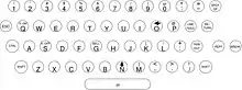 The printing mechanism is usually geared to run at a maximum ten characters per second speed, or 100 words per minute (wpm), but other slower speeds were available: 60 wpm, 66 wpm, 68.2 wpm, and 75 wpm.[12] There are also many typefont options. The Teletype Parts Bulletin[13] listed 69 available Model 33 type element factory-installed options (frequent type element changes in the field were impractical). The type element, called a "typewheel" in Teletype's technical manuals, is cylindrical, with characters arranged in four tiers, 16 characters per tier, and thus is capable of printing 64 characters. The character to be printed is selected by rotating the typewheel clockwise or anticlockwise and raising or lowering it, then striking the typewheel with a padded hammer, which impacts the element against the ink ribbon and paper.[14]