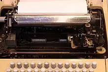 As a cost-saving measure, the optional paper tape mechanisms were dependent on the keyboard and page printer mechanisms. The interface between the paper tape reader and the rest of the terminal is completely mechanical, with power, clock, and eight data bits (which Teletype called "intelligence") all transmitted in parallel through metal levers. Configuration of user-selectable options (such as parity) is done with mechanical clips that depress or release various levers. Sensing of punched holes by the paper tape reader is done by using metal pins which mechanically probe for their presence or absence.[10] The paper tape reader and punch can handle eight-bit data, allowing the devices to be efficiently used to download or upload binary data for computers.[9]