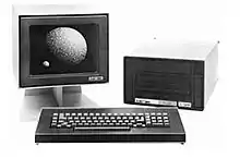 The Terak 8510 was a tabletop computer system (alternatively described as a minicomputer and a microcomputer) built from a DEC LSI-11.[2][3]: 160 The chassis that houses the processor contains one 8-inch floppy disk drive, plugged into a controller that supports writing 3740-formatted disks; three additional external drives could be installed (Terak 8512). The 8510 comes with a minimum of 4 KB of memory stock, expandable to 20 KB. A 12-inch CRT-based terminal (the Terak 8530) and series of line printers (the Terak 8540 family) were available as options.[3]: 161 The computer was aimed at education and small businesses and had an initial software base comprising a line editor, a linker, a batch processor and a macro assembler, as well as compilers for Fortran IV and BASIC.[2] The company followed up with the graphical Terak 8510/a in December 1977.[4][5] The 8510/a bumped its predecessor's maximum RAM to 56 KB and included the terminal as standard issue. It was capable of displaying monochrome[6] bitmapped graphics at a resolution of 320 by 240 pixels from any contingent area of memory. As well, it could display text; the computer was also capable of display text and graphics simultaneously, contents overlapping, since both modes of display were independently controlled.[5] The Terak 8510/a was succeeded by the Terak 8600, which featured dual 16-bit microprocessors and Q-Bus slots for expansion. It came with a litany of framebuffer boards, allowing the display of eight colors in the new 640-by-480-pixel and 320-by-240-pixel modes. Additional framebuffer boards could be installed to allow the computer to display 64 colors in 640-by-480-pixel mode.[6]