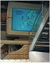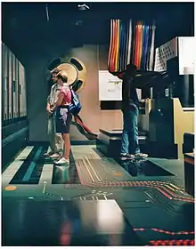 The purpose of the exhibit was to show the anatomy of a computer and to explain how the various parts work and communicate with each other. Before entering the computer's chassis, visitors could roll a giant trackball to play "World Traveller" on the giant screen. Wall-sized graphics by David Macaulay and interactive exhibits explained how all kinds of information, from text, graphics, video, music, as well as computer programs can be represented as 1's and 0's. Inside the giant chassis, visitors walked between a wall-sized graphics card and memory card to the microprocessor, upon which a projected electron microscope imagery of a CPU's circuits in operation appeared. Further on, a RAM set of modules plugged into the motherboard included reveals showing electron microscope imagery of memory circuits, Peering into a mini-van sized hard drive, visitors could see read/write heads position themselves on either side of rotating platters.[21][22][23] Richard Fowler was recruited from The Science Museum, London/Bradford, as exhibit designer. The exhibit garnered international publicity and more than doubled visitor traffic to the museum.
